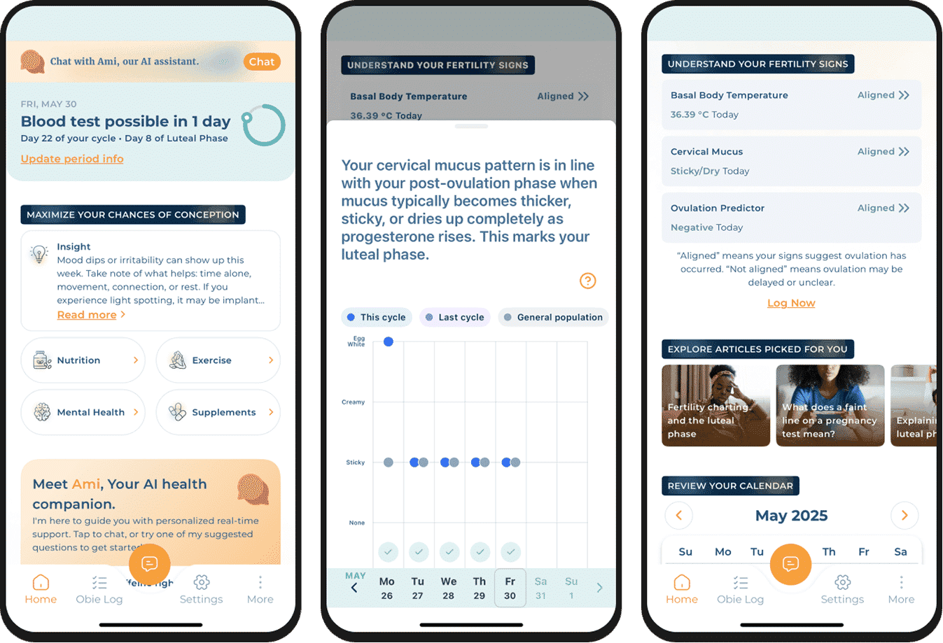Obie’s built-in AI interprets your fertility signs and cycle data to guide you day-to-day in your TTC journey.