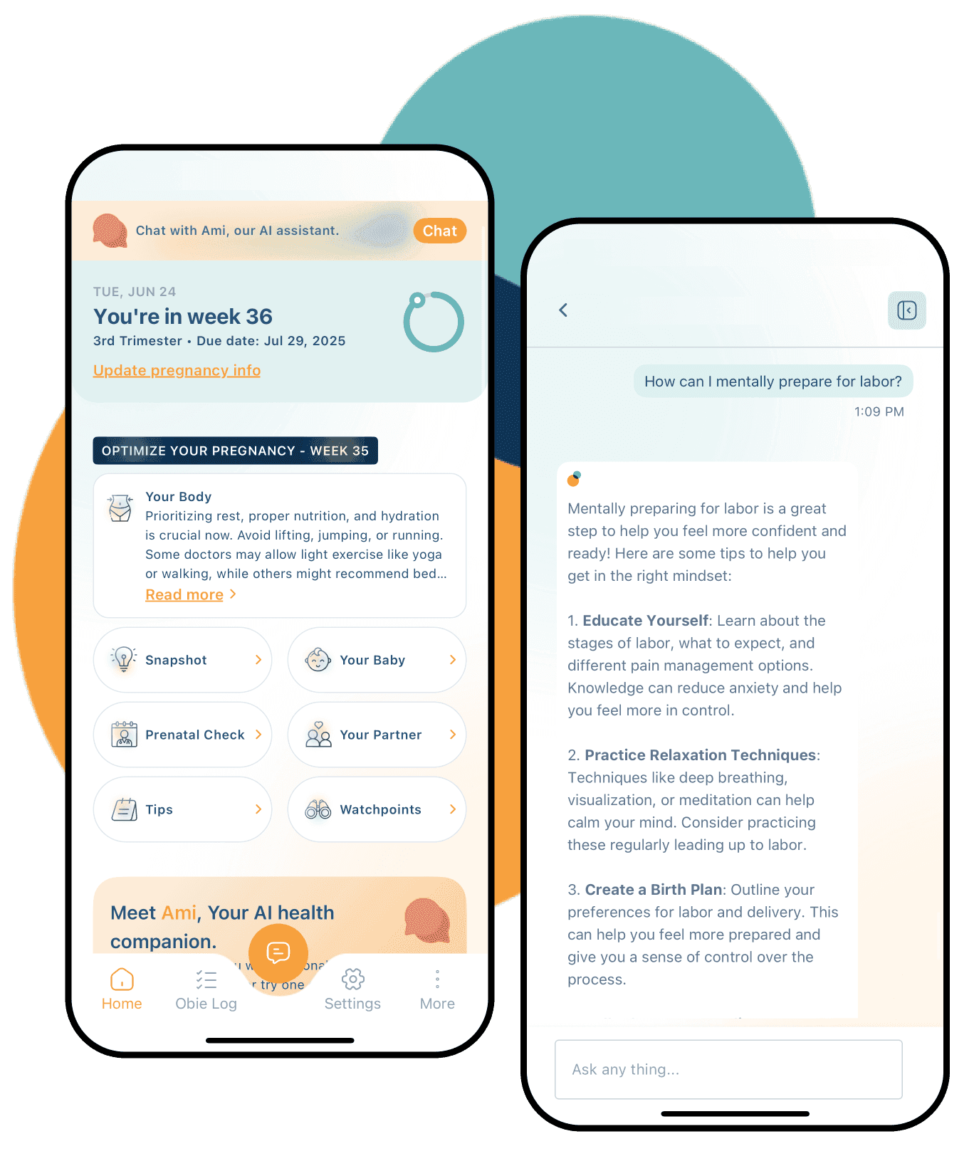 Obie gives you real-time tips to manage labor, track symptoms, and prepare for delivery — with AI guidance tailored to your stage.